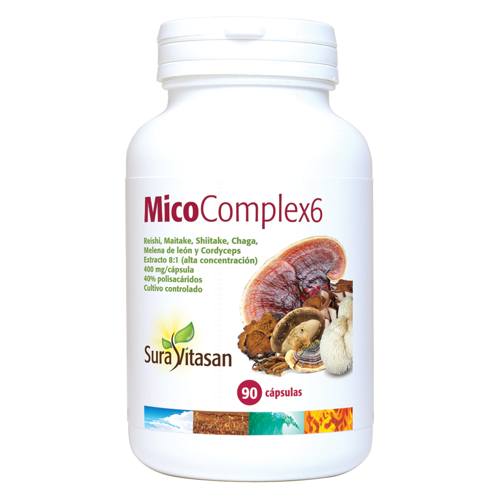 Mico Complex 6 es una combinación exclusiva de 6 hongos medicinales altamente concentrados (extracto 8:1). Los hongos, que incluye nuestra formulación proceden de cultivos sostenibles y controlados ya que crecen en invernaderos en condiciones de control climatológico y libres de metales pesados, herbicidas y pesticidas para garantizar la pureza y potencia de los extractos. Cada cápsula vegetal aporta 400 mg de una combinación de los hongos medicinales Reishi, Maitake, Shiitake, Chaga, Melena de León y Cordyceps, apta para celíacos, vegetarianos y veganos.