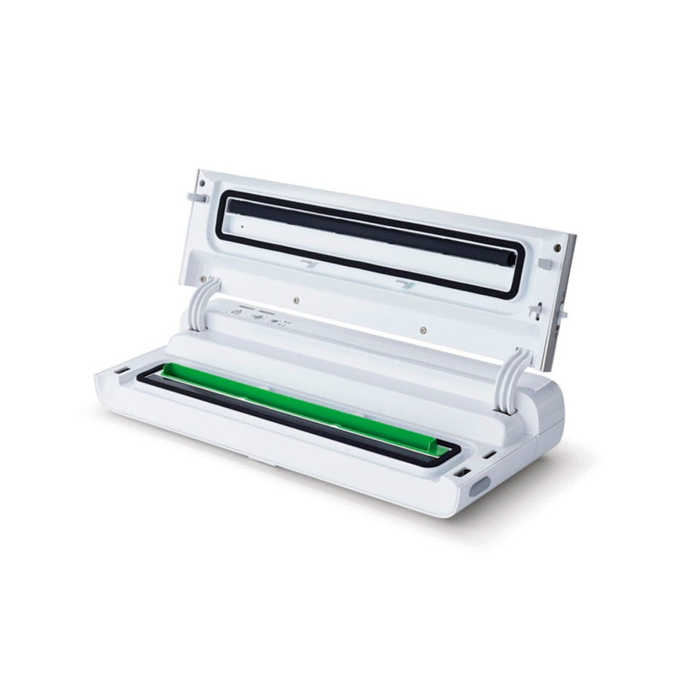 Máquina para envasar al vacío, de uso doméstico: envasadora al vacío FoodSaver, modelo VS0100X. Permite conservar los alimentos al vacío en bolsas con un sellado fuerte y hermético o en contenedores de Tritán de modo que se prolonga la conservación de los alimentos hasta cinco veces más tiempo que utilizando otros medios de conservación y además, reduciendo el desperdicio un 35% en comparación con otros modelos Foodsaver.