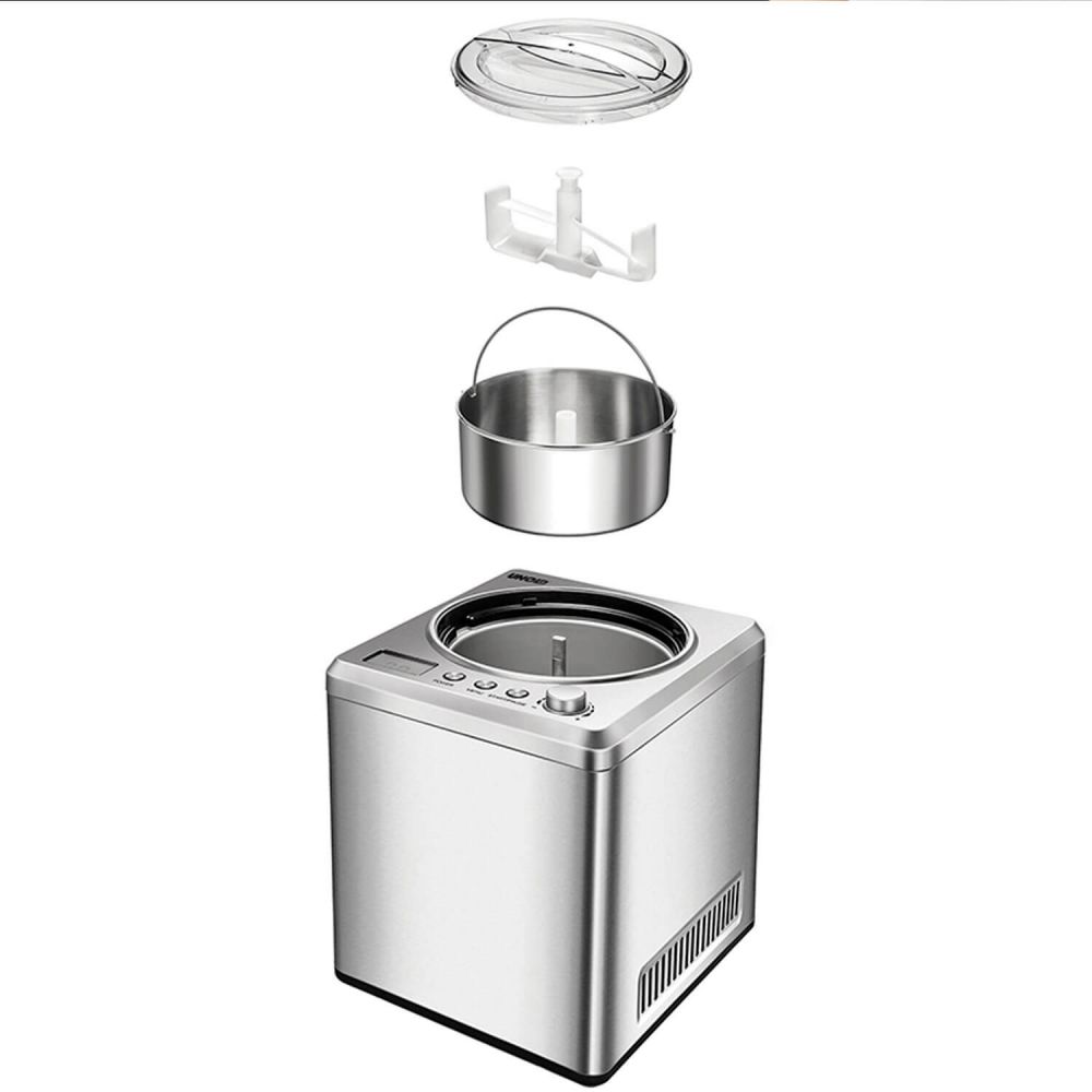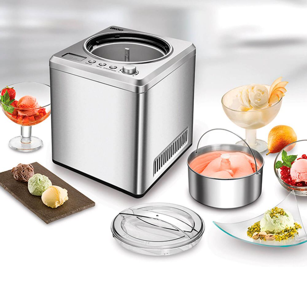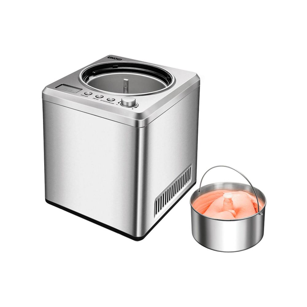 Heladora con compresor, de 2 litros de capacidad. Con molde y carcasa exterior de acero inoxidable, de Unold. Para hacer helado casero y artesanal en casa con calidad profesional, también para hacer helados sin lactosa, sin azúcar o helados veganos.